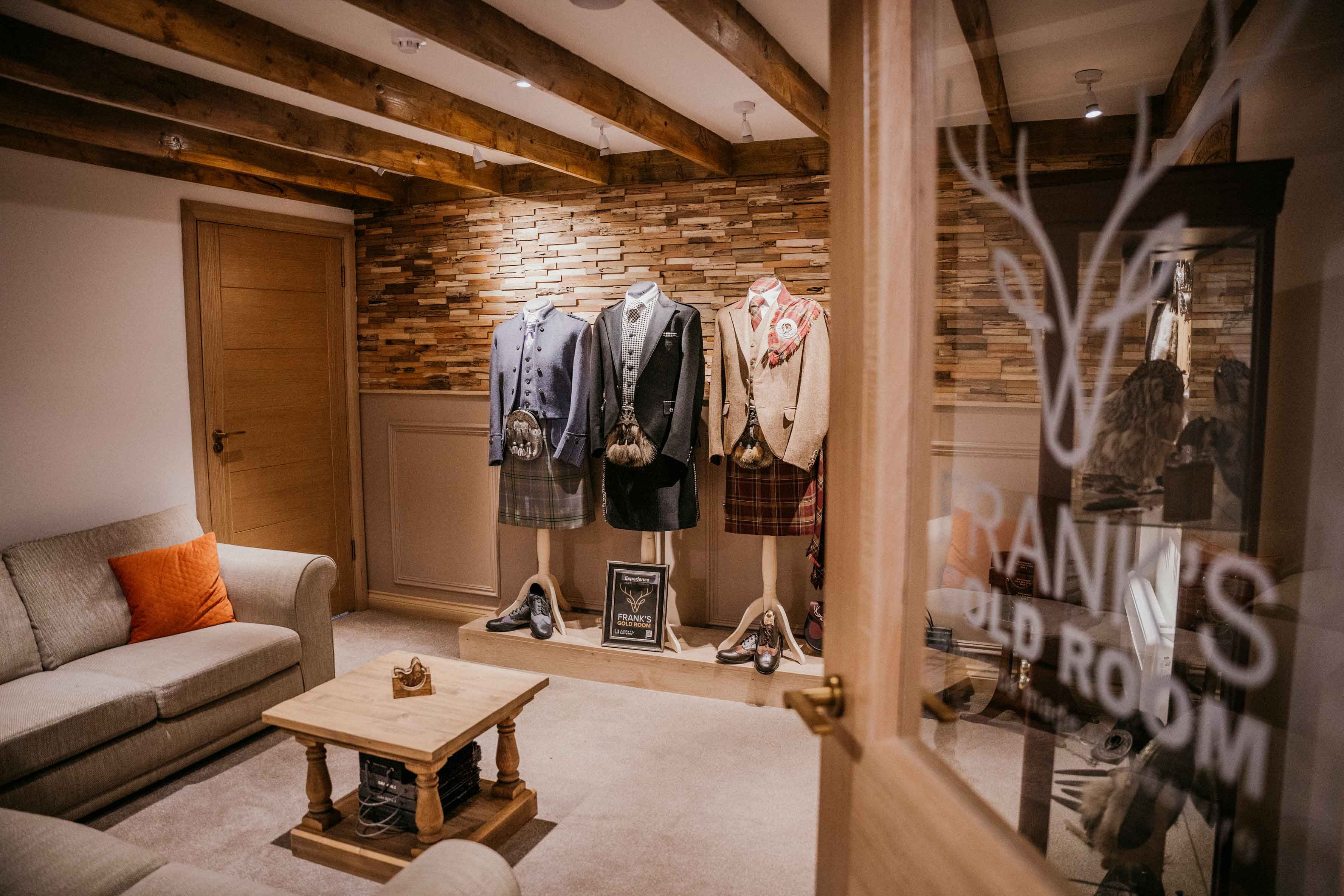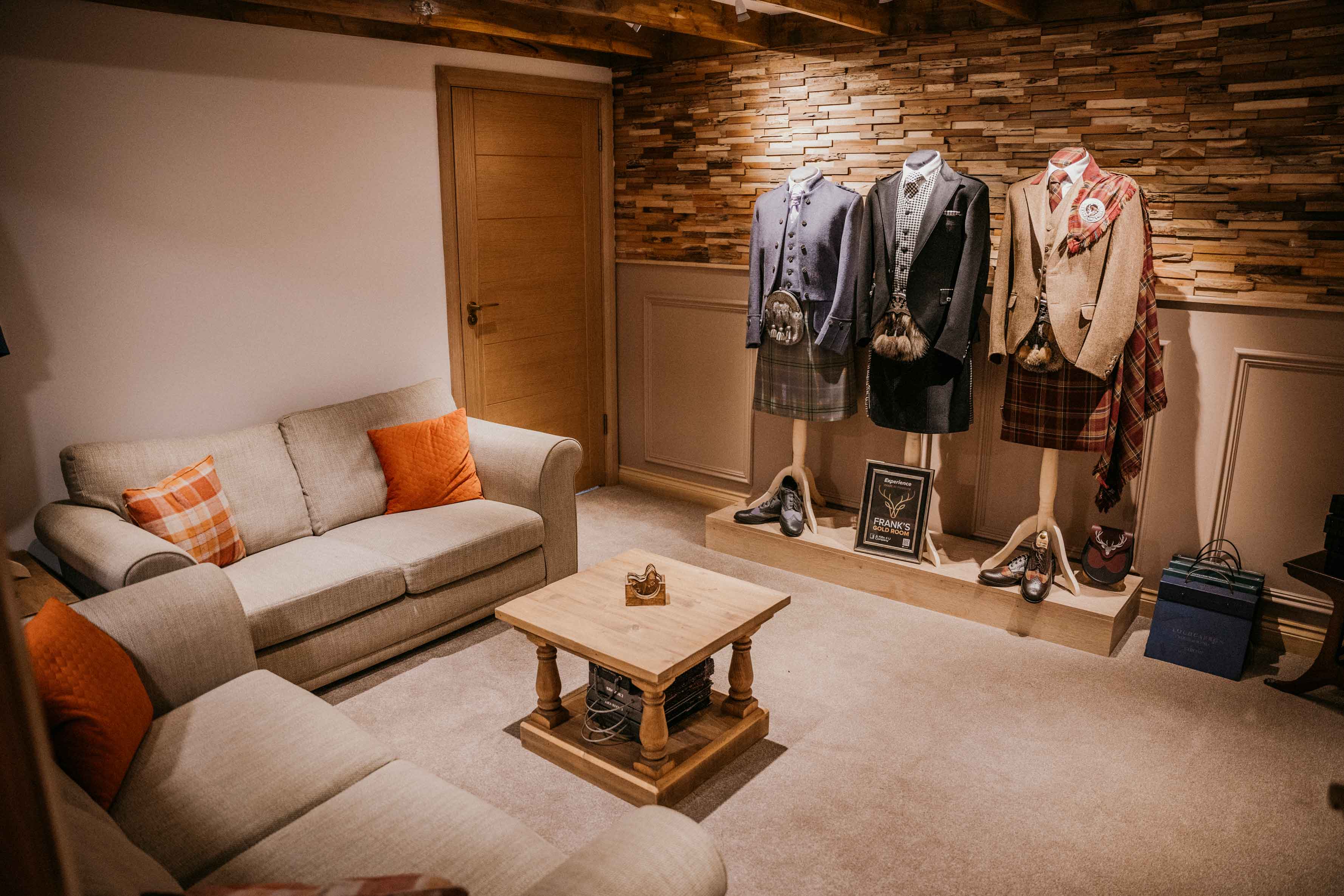 Frank’s Gold Room is our premium made-to-measure experience, where you can design your own bespoke Highlandwear in a luxurious, private setting — complete with refreshments from Harris Gin and The Clydeside Distillery.