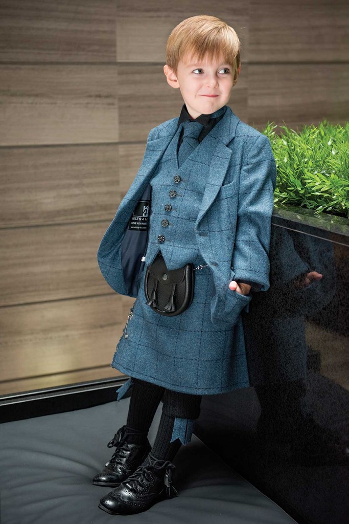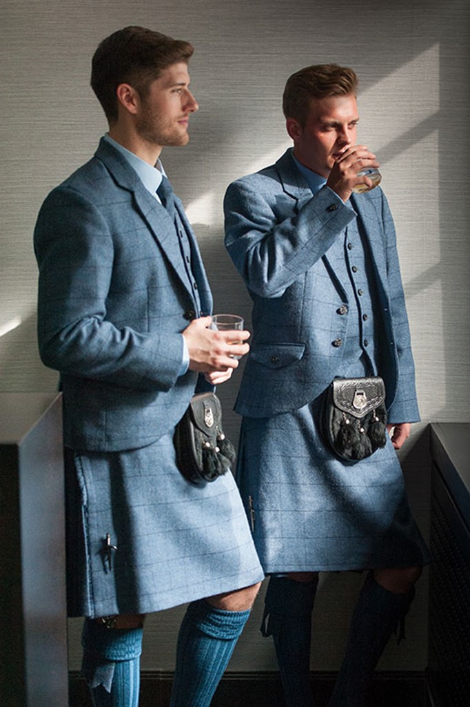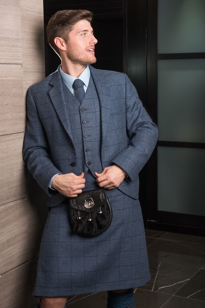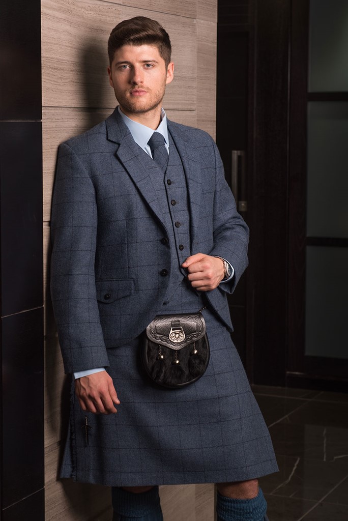 The Cairngorm Blue tartan kilt outfit is available either to own as a Grooms bespoke made to measure outfit with matching accessories and also available to hire.