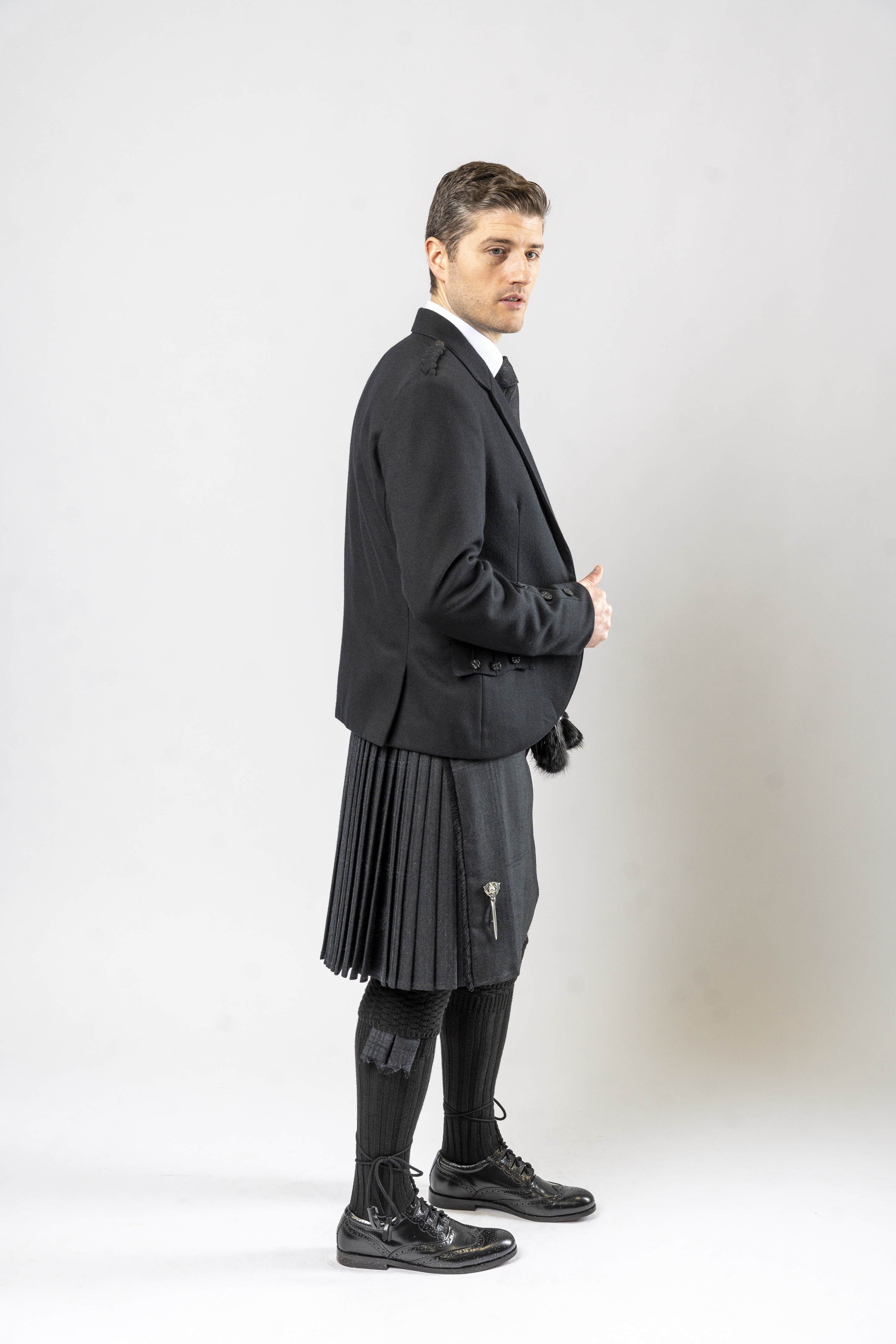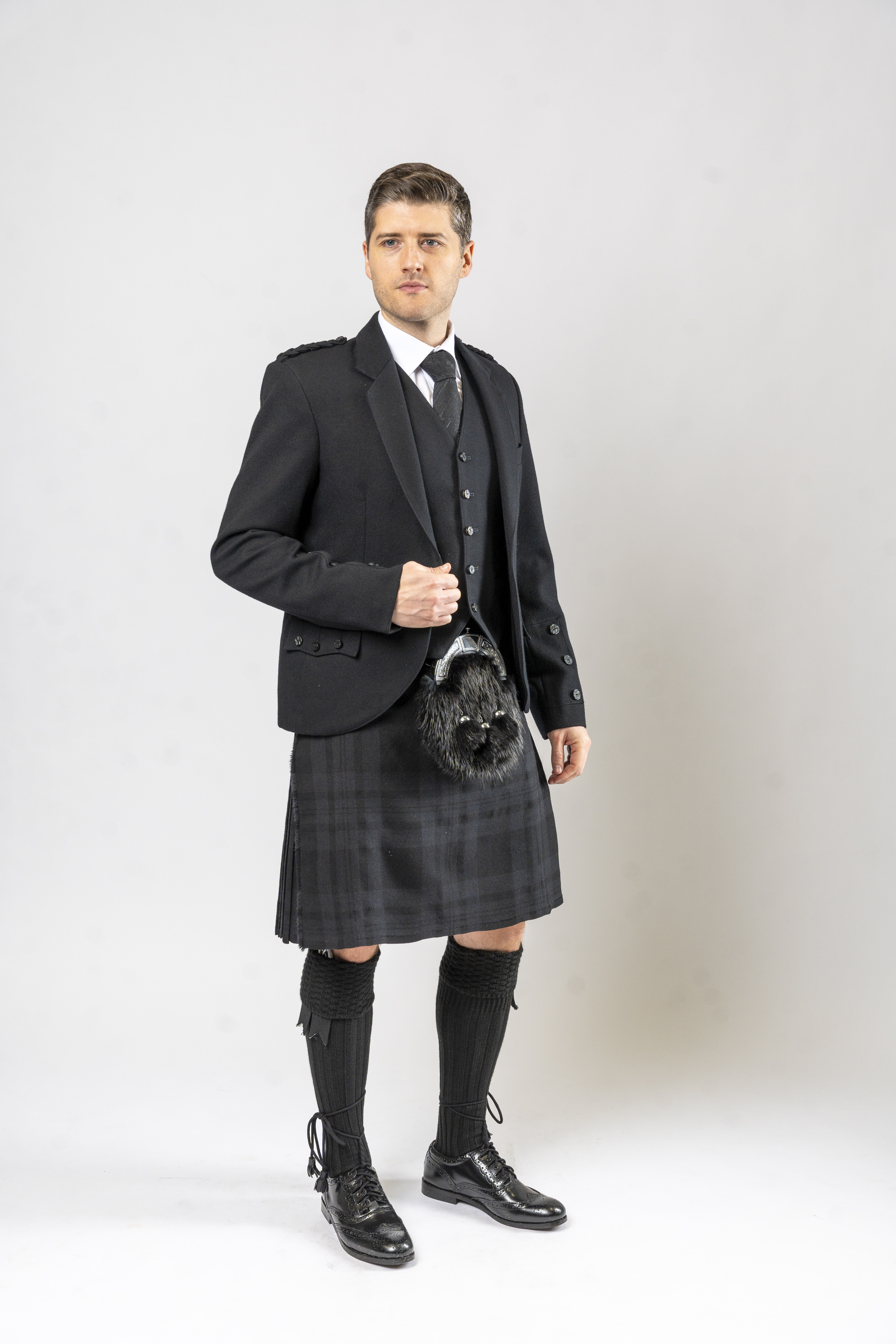 Developed in one of the few Scottish mills capable of such intricate craftsmanship, this tartan features a bold deep black base subtly accented with refined tonal highlights, symbolising heritage, strength, and understated elegance. The result is a kilt that balances modern sophistication with ancestral pride, ideal for those seeking a distinctive yet deeply rooted Highland look.