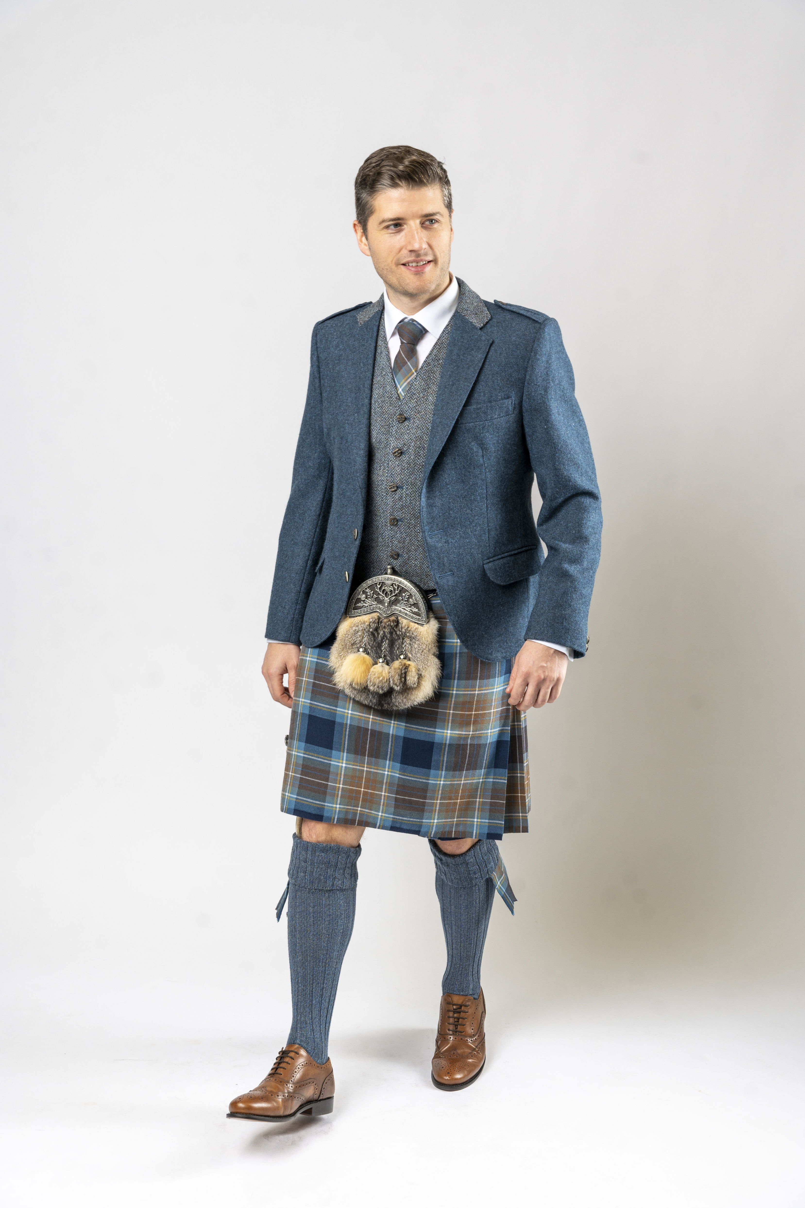 Paired with a contrasting waistcoat in specialist Harris Tweed, the ensemble introduces texture and subtle colour contrast, perfectly complementing blue-toned tartans such as Loch Tay, Holyrood, or Lovat Blue kilts. Imitation staghorn buttons add a refined touch, enhancing the jacket’s contemporary appeal while maintaining a classic Highland aesthetic.