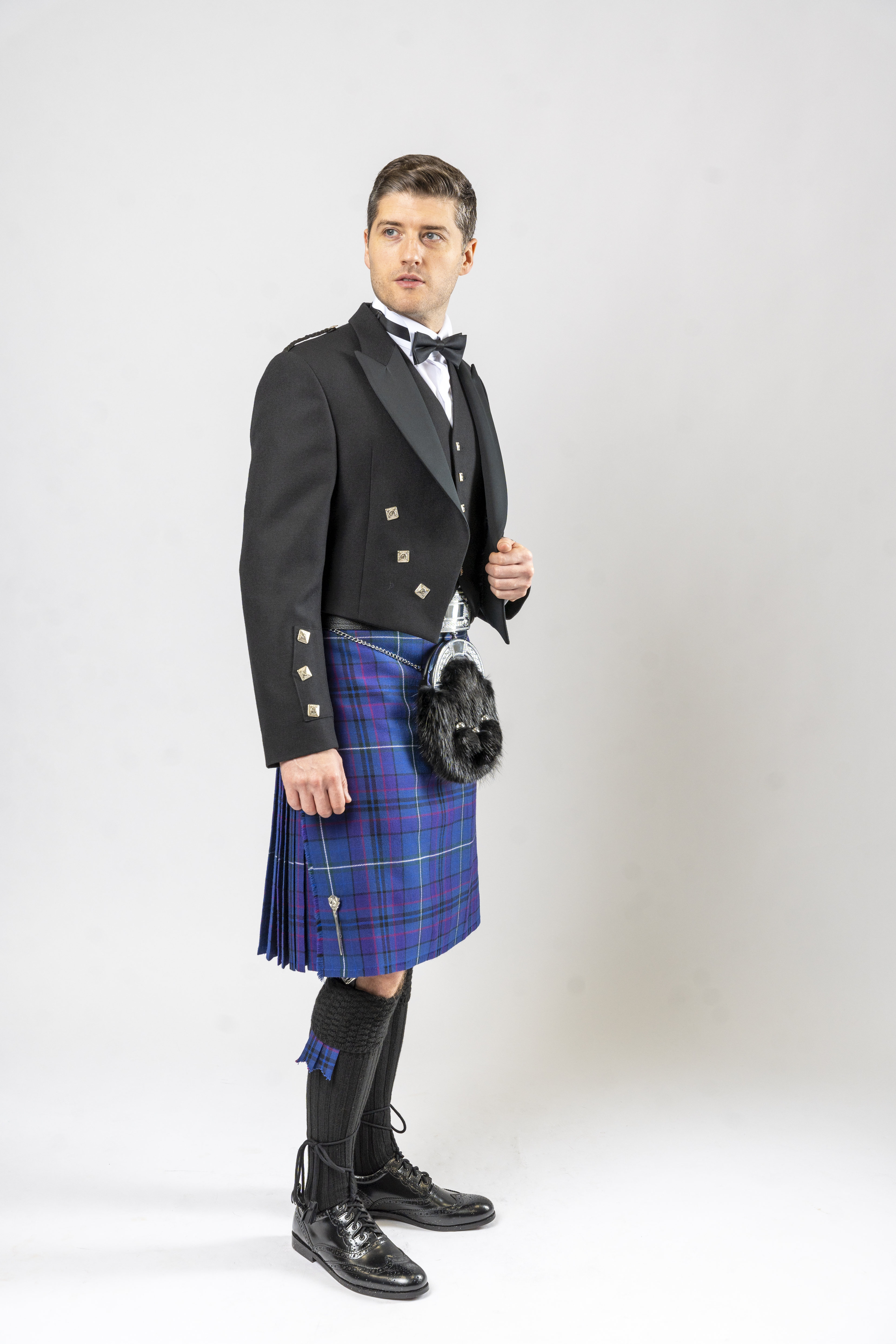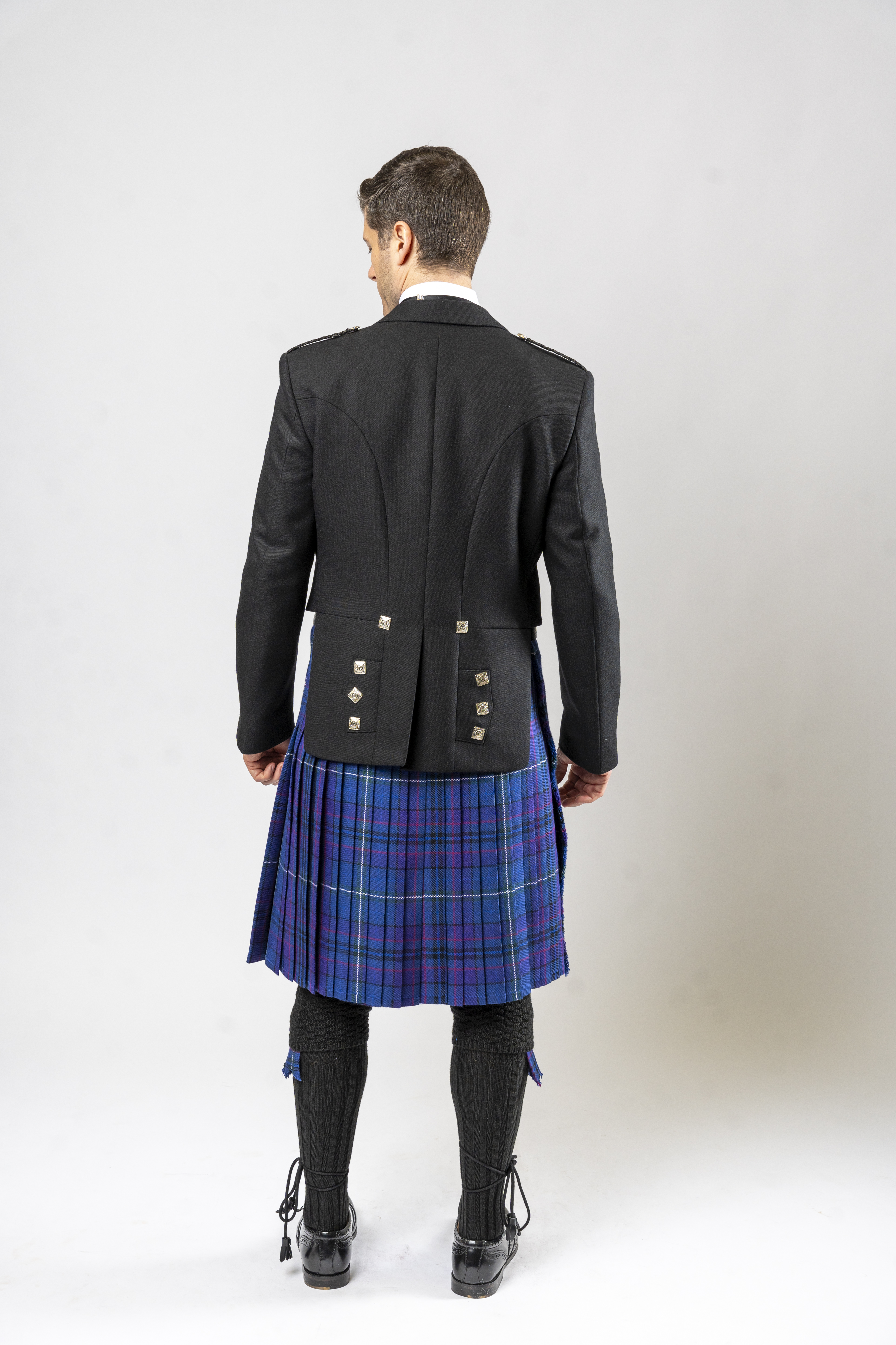 One of the earliest and most iconic styles of traditional Scottish Highland dress, this ensemble is celebrated as one of the smartest and most formal. The jacket features a classic tail design at the back and silver dress buttons on both the jacket and five-button waistcoat, exuding timeless elegance. Twisted-style epaulets are thoughtfully designed to accommodate a groom’s plaid, making it perfect for weddings or ceremonial occasions.