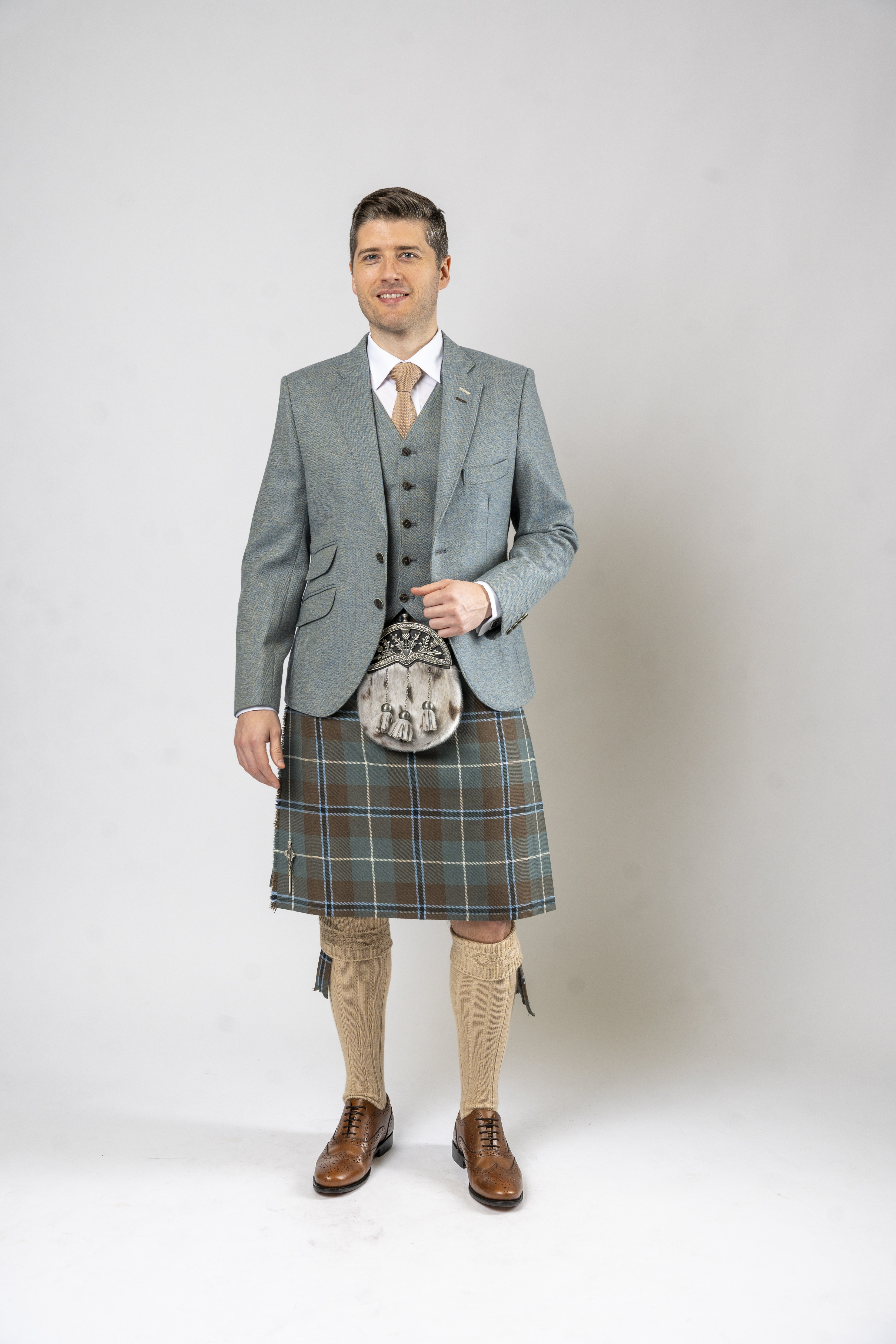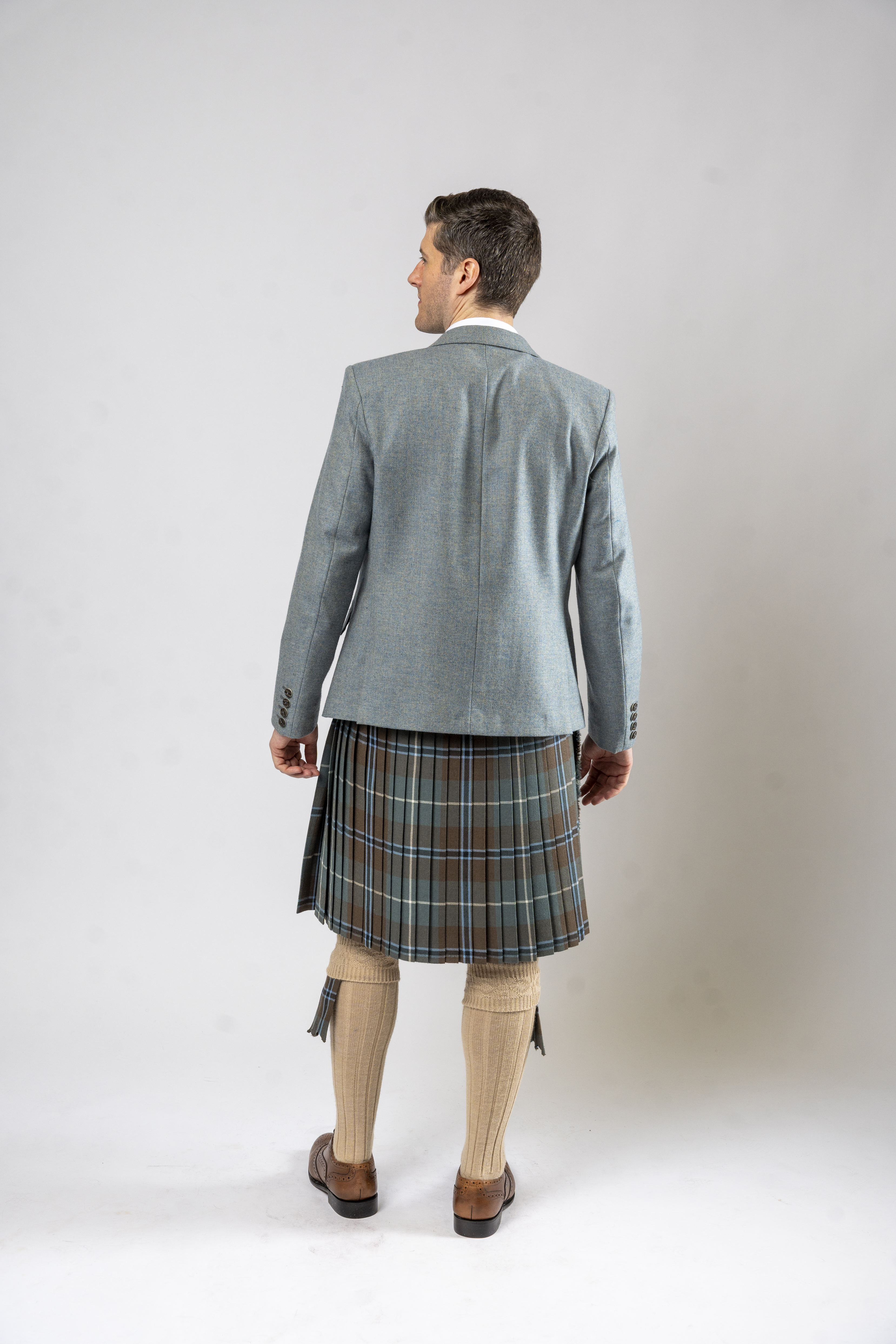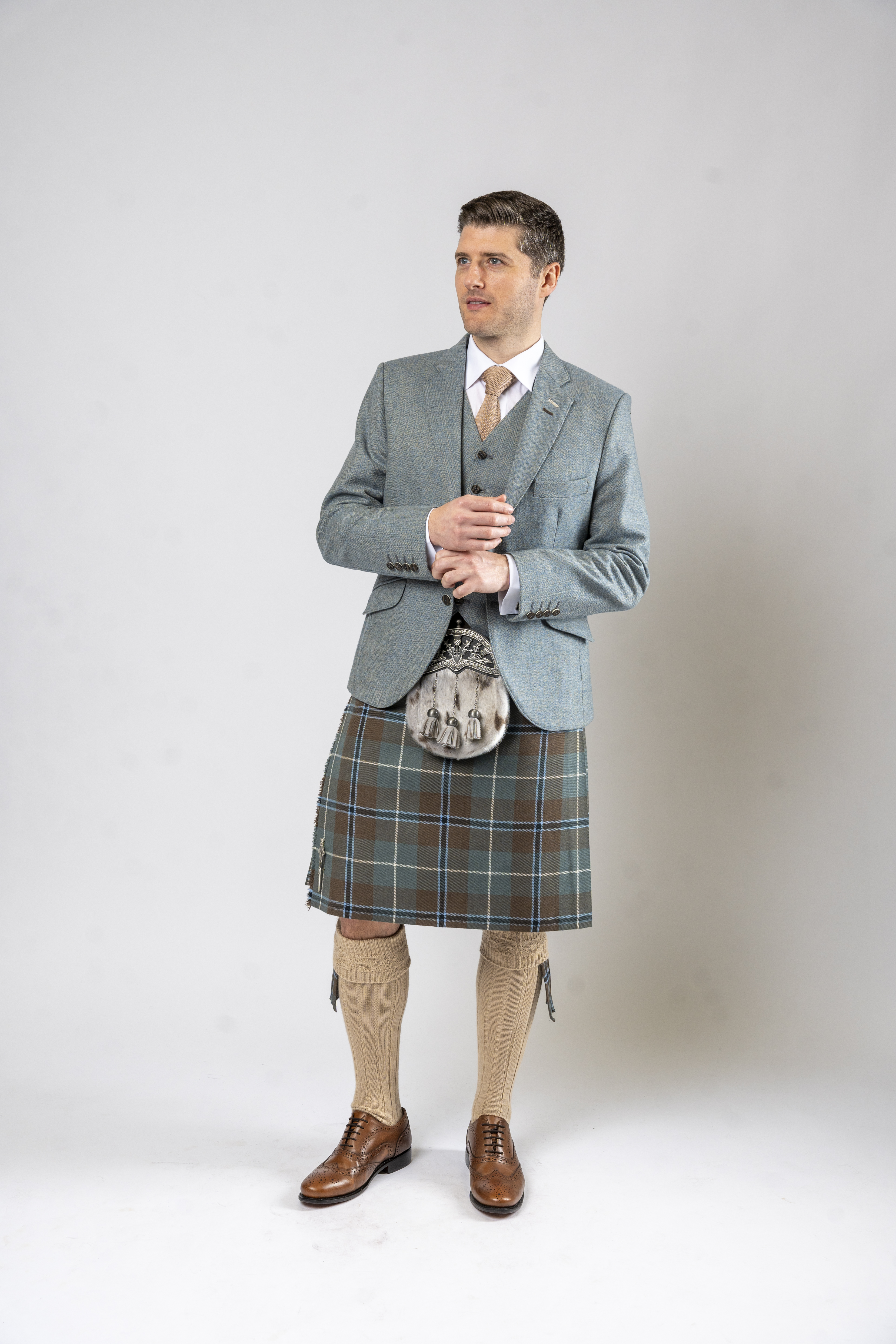 The Douglas Weathered Tartan Kilt in the light blue and brown colourway offers a soft, vintage-inspired twist on a classic pattern. This tartan features gentle, weathered shades of light blue and warm brown, creating a harmonious and earthy palette. The light blue adds a cool, calming touch, while the rich brown brings warmth and depth, both subtly faded to evoke a sense of aged elegance. This kilt embodies a timeless, worn-in look that beautifully reflects the heritage and enduring spirit of the Douglas clan.