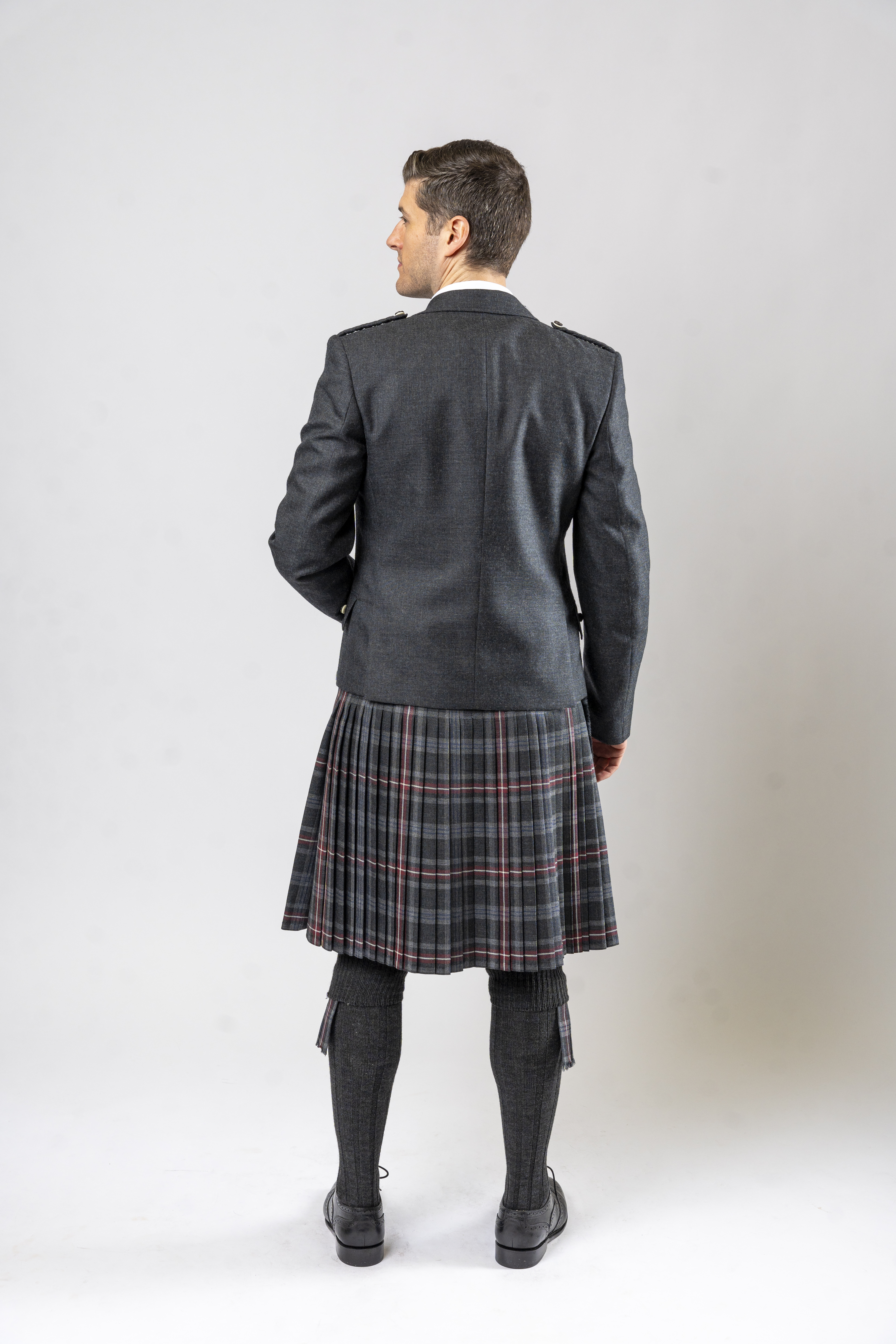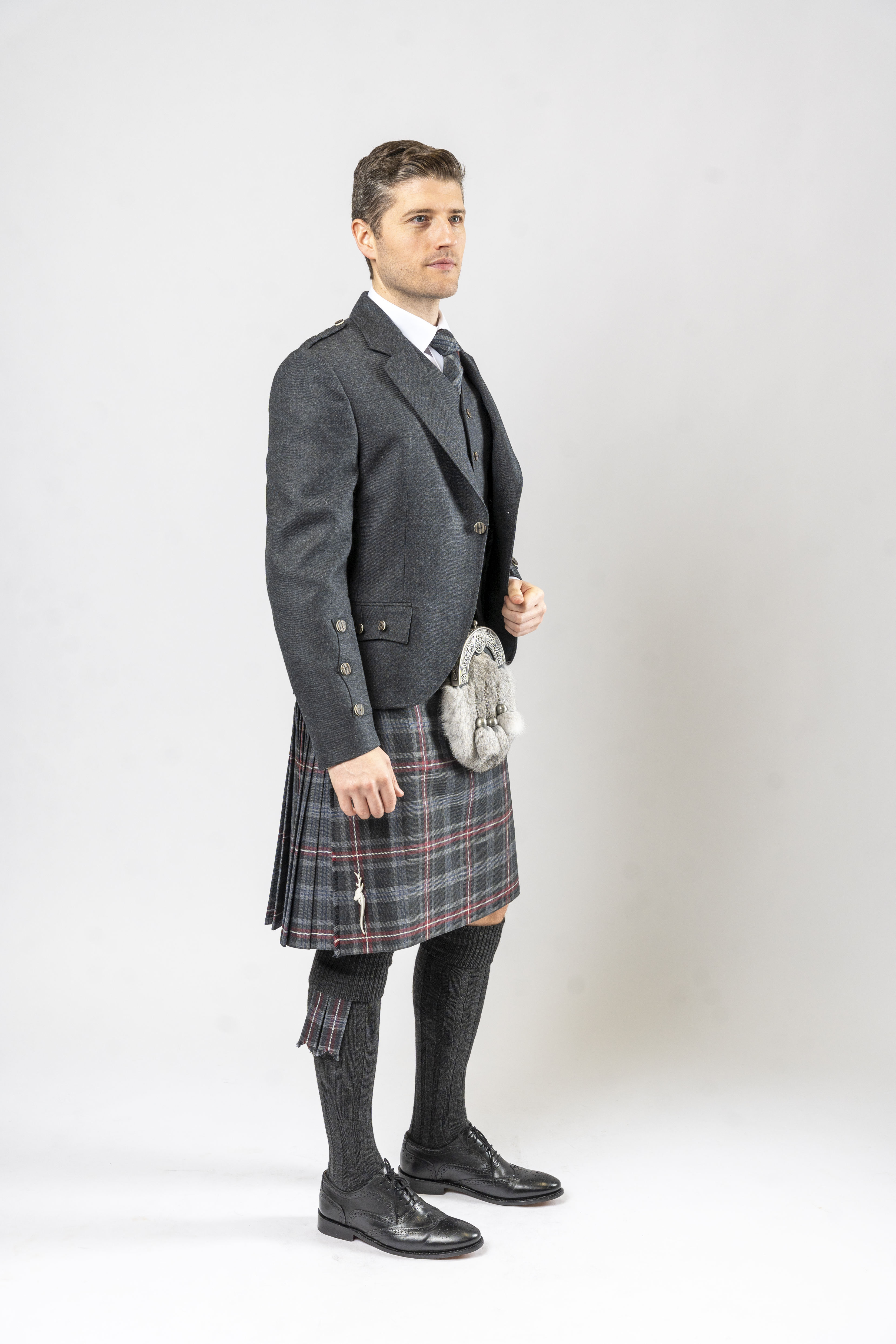 The Hebridean Heather Tartan Kilt boasts a deep, smoky grey foundation, elegantly woven with sophisticated over-checks of rich burgundy and soft silver-grey, while shimmers of blue cross subtly across the pattern, capturing the mystique and beauty of Scotland’s rugged Hebridean landscape.