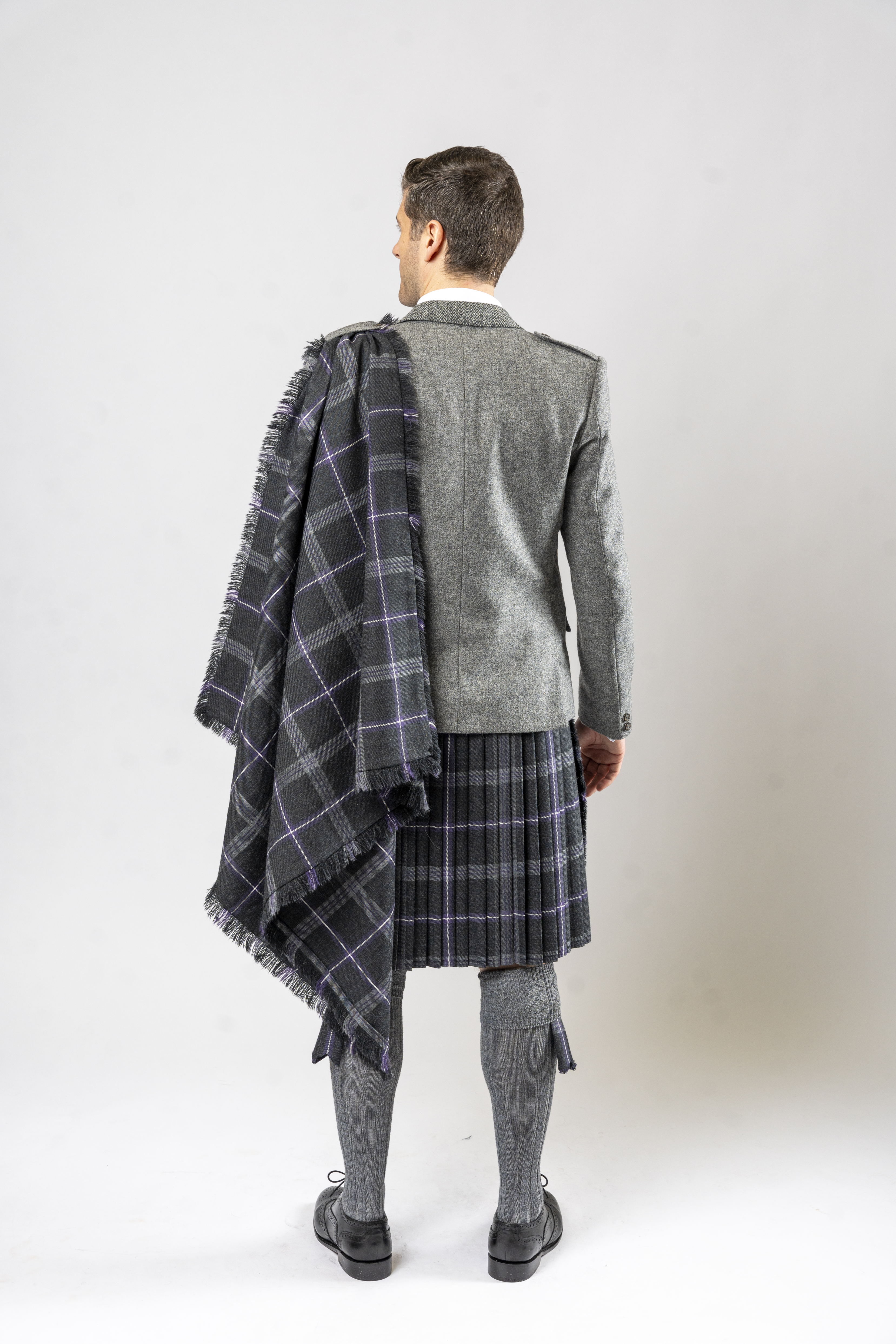 The Fly Plaid is made of the same Tartan as the Kilt & is worn over the shoulder as part of the traditional kilt outfit. The plaid is darted & stitched in one corner so when pulled through the left epaulet and pinned with a brooch it will fall in loose folds over the shoulder & down the back of the wearer.