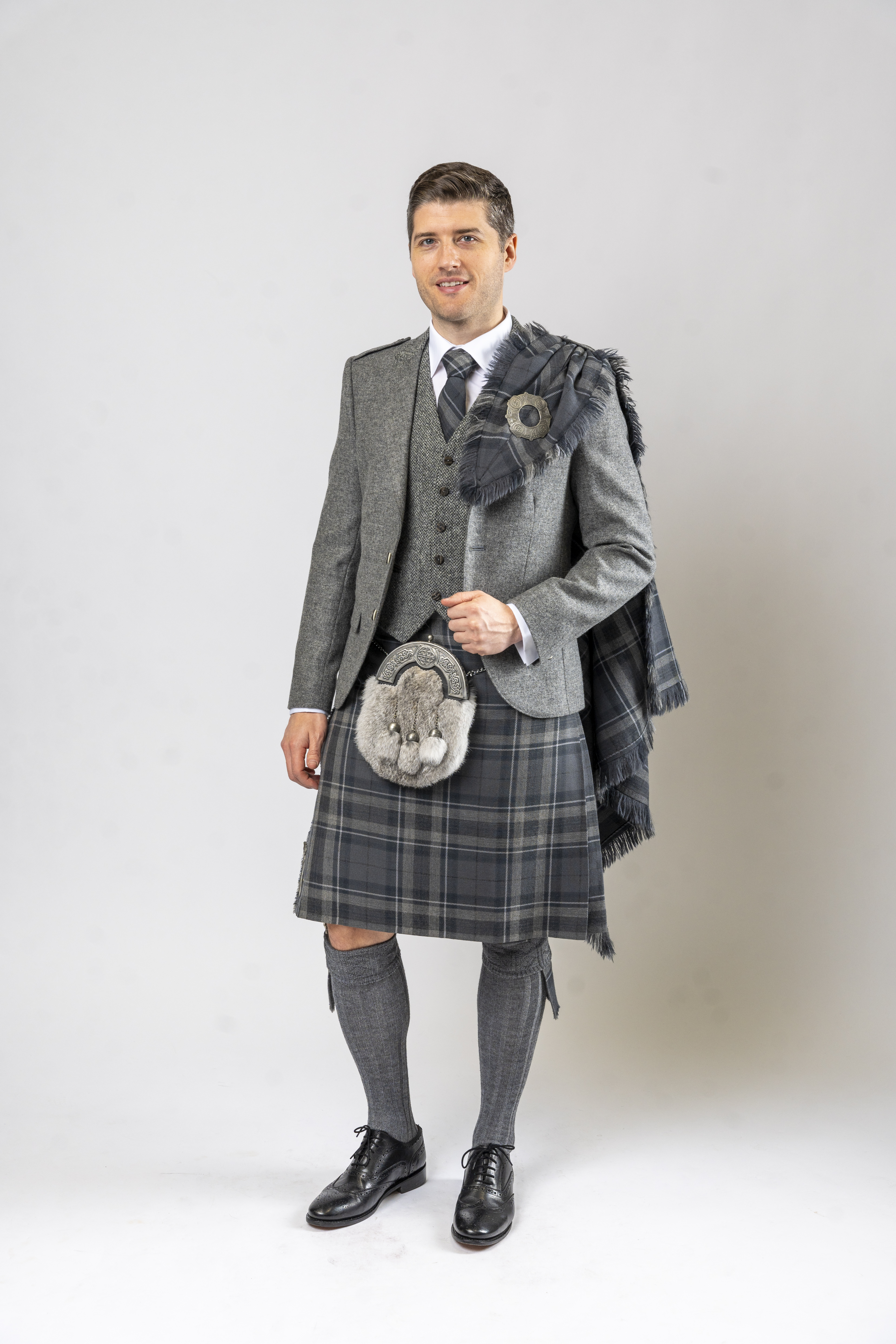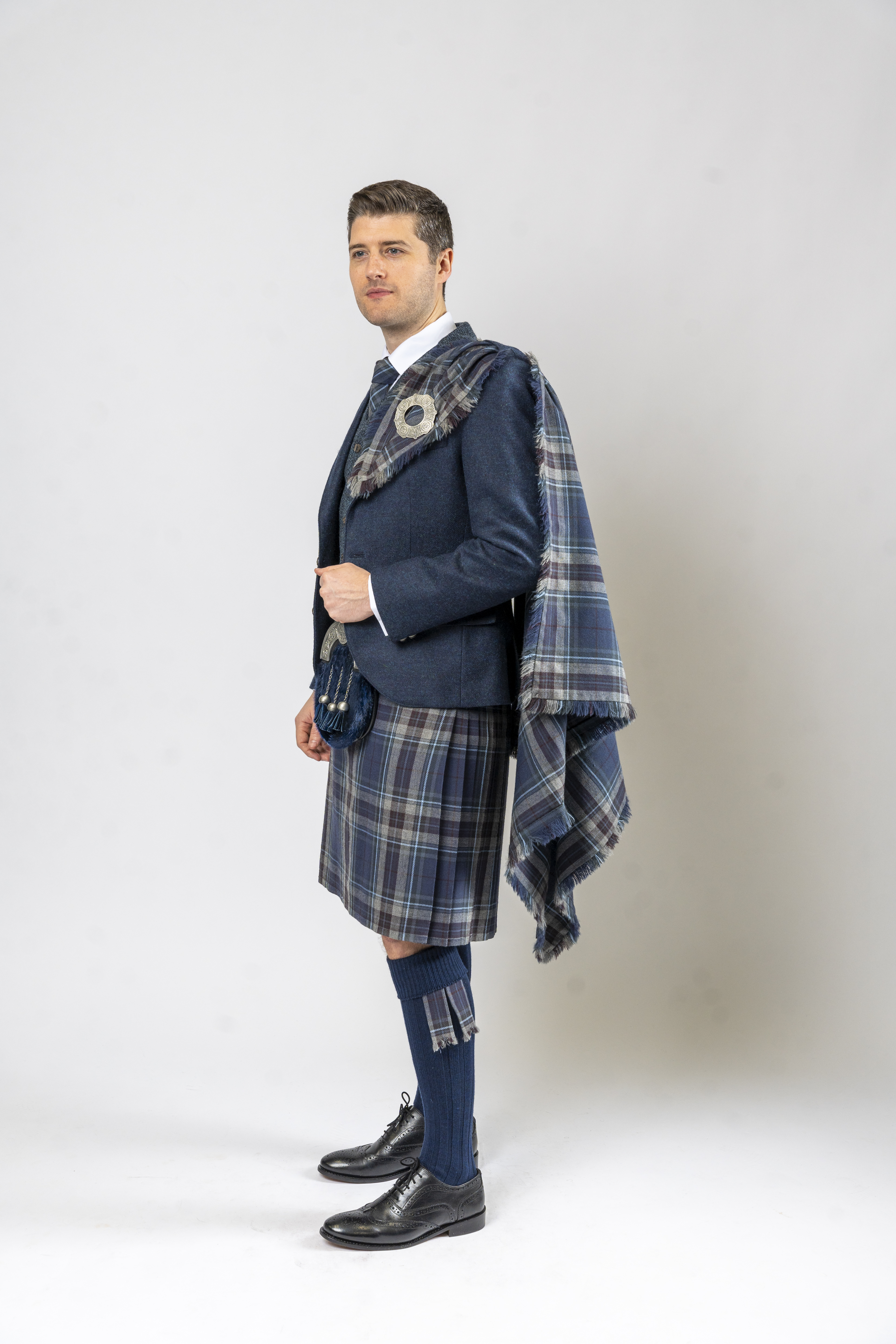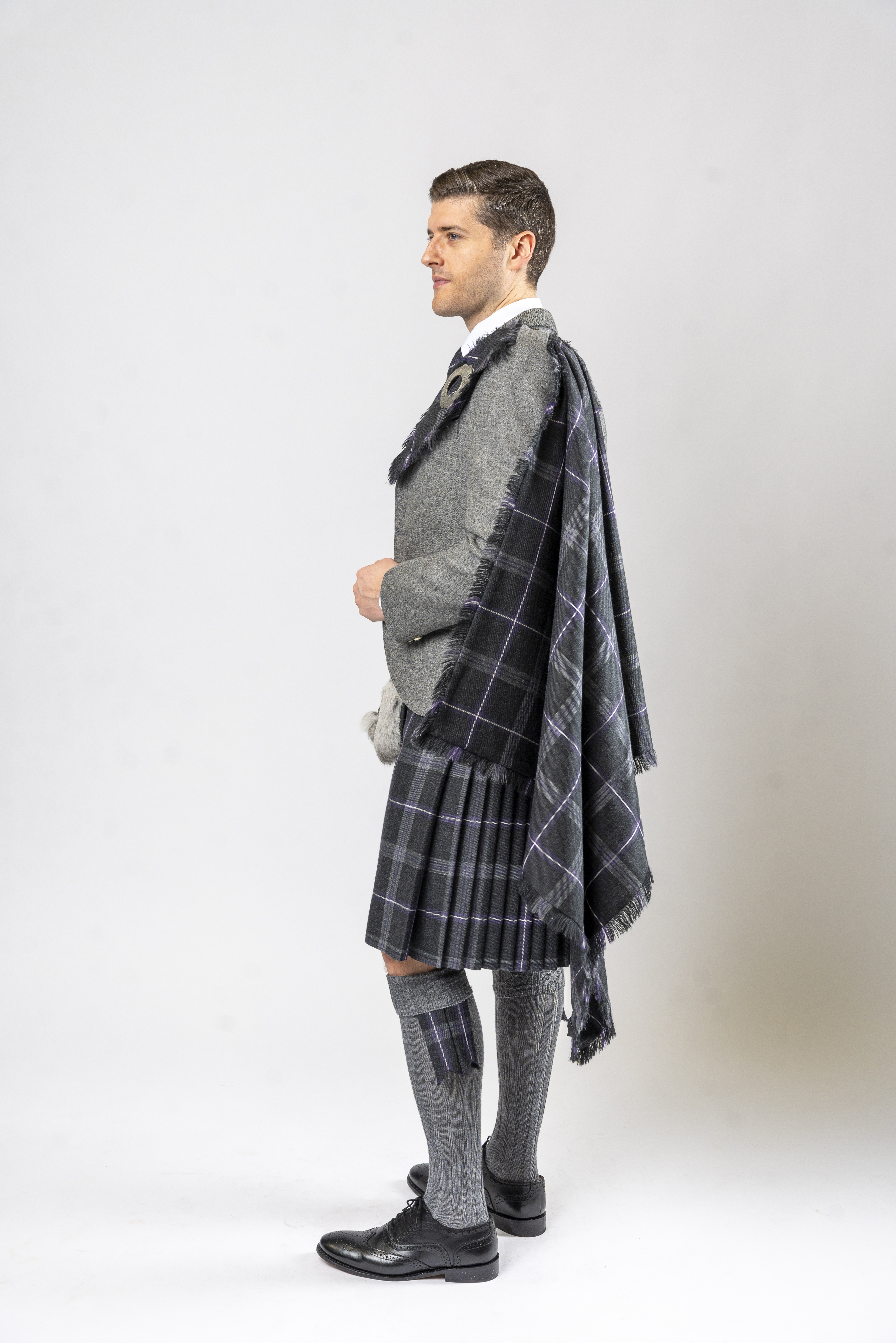 The Fly Plaid is made of the same Tartan as the Kilt & is worn over the shoulder as part of the traditional kilt outfit. The plaid is darted & stitched in one corner so when pulled through the left epaulet and pinned with a brooch it will fall in loose folds over the shoulder & down the back of the wearer.