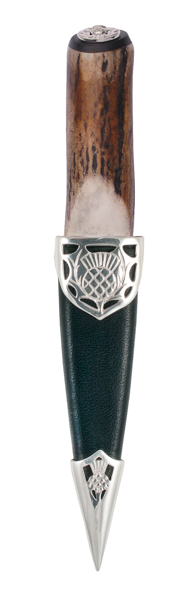 Hallmarked in Edinburgh, Scotland. The Staghorn Sterling Silver Sgian Dubh uses casted, fallen or shed horn for the handle so no harm is done to the animal during the sustainable collection. The blade is made from Sterling Silver and comes covered with a genuine leather sheath.