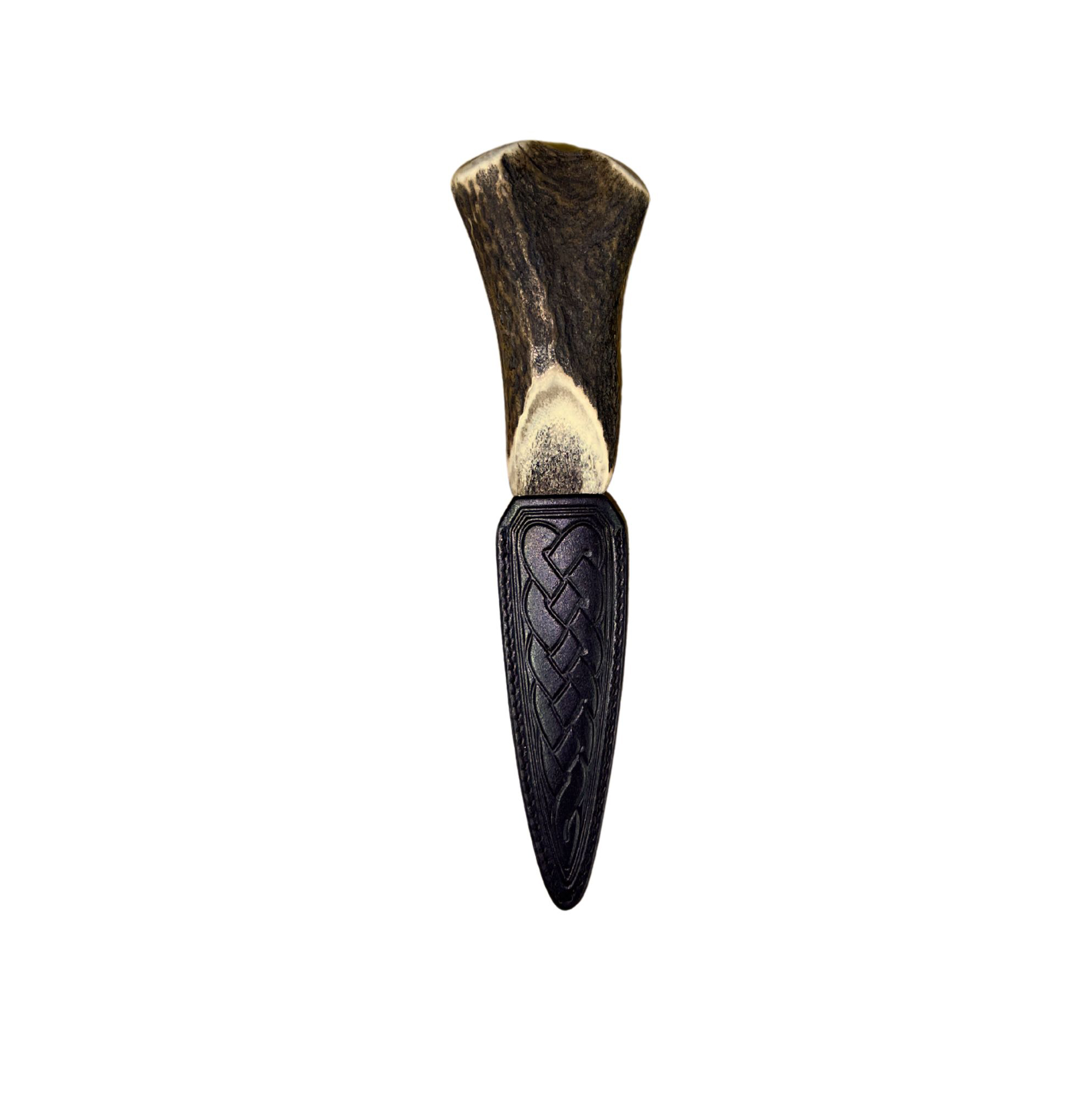 Proudly handmade in Scotland, it comes complete with a black leather sheath and is designed to be securely tucked into our premium kilt hose, proudly displaying the beautifully crafted handle. Each piece is uniquely handcrafted from real staghorn, making every sgian dubh a one-of-a-kind natural creation — no two are ever the same.