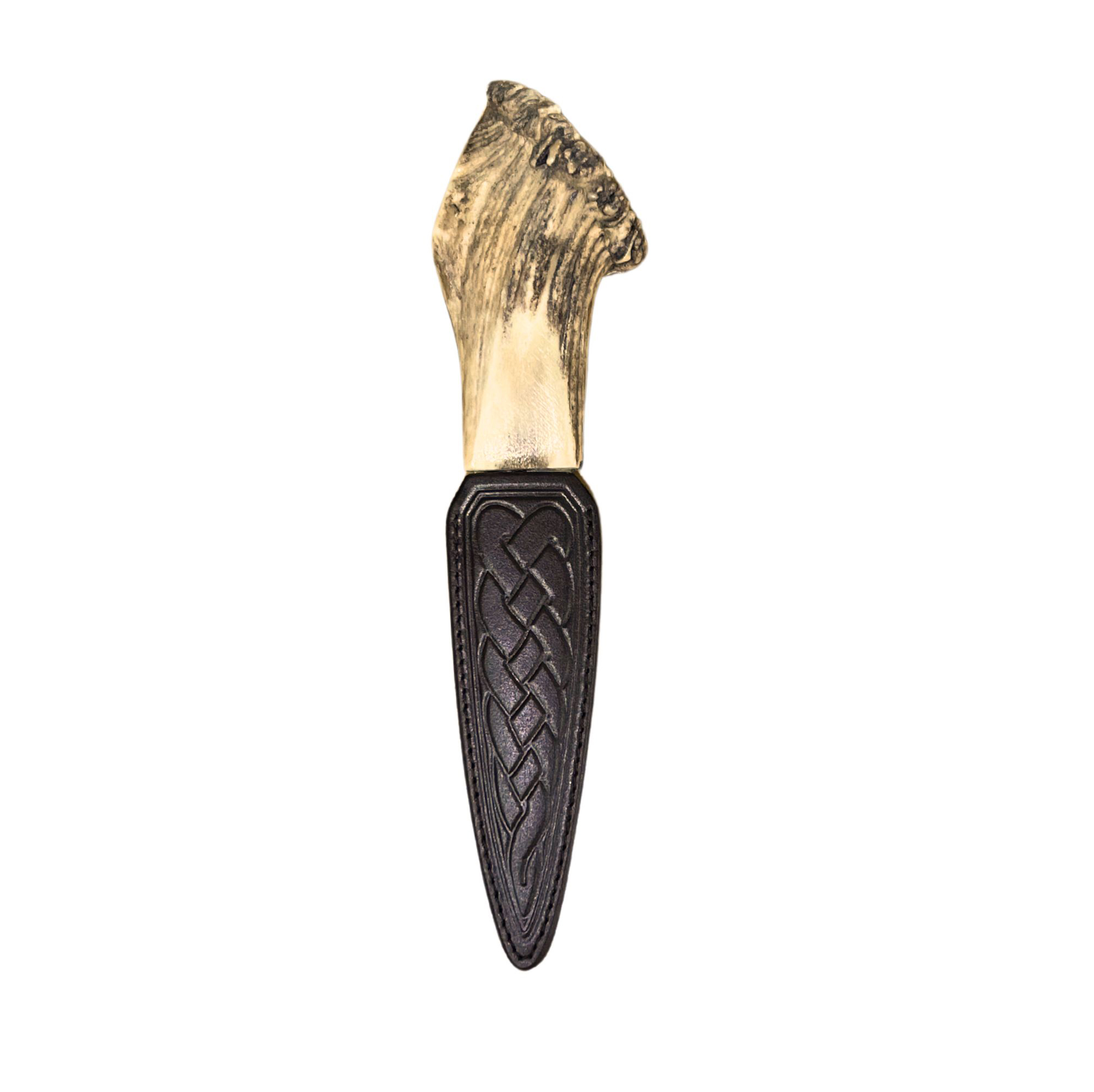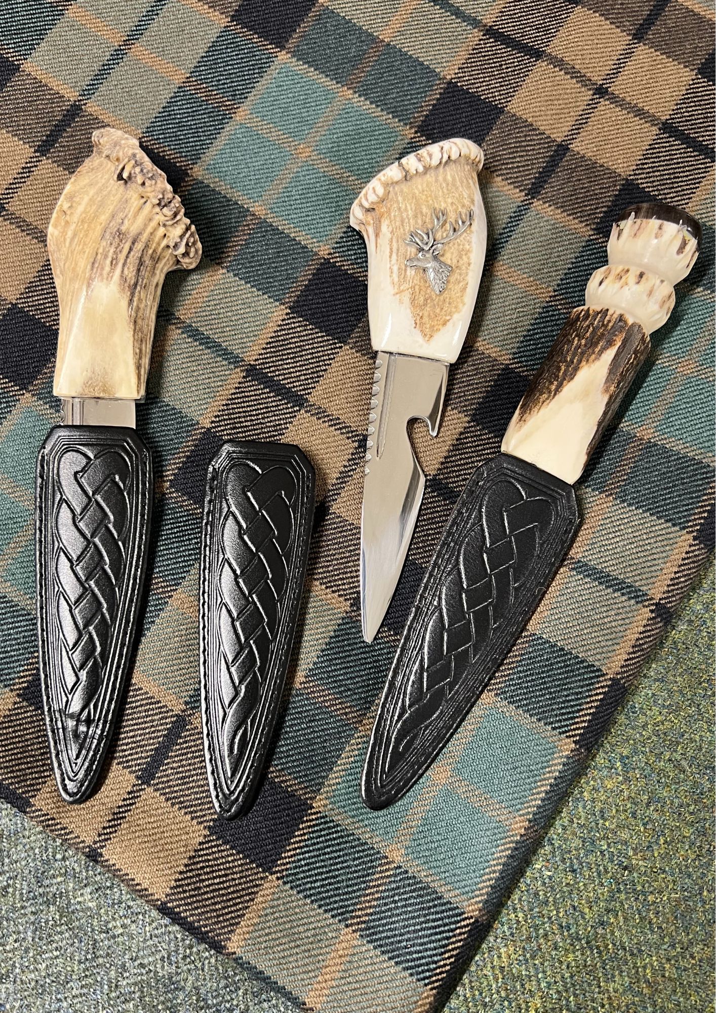 Proudly handmade in Scotland, it comes complete with a black leather sheath and is designed to be securely tucked into our premium kilt hose, proudly displaying the beautifully crafted handle. Each piece is uniquely handcrafted from real staghorn, making every sgian dubh a one-of-a-kind natural creation — no two are ever the same.