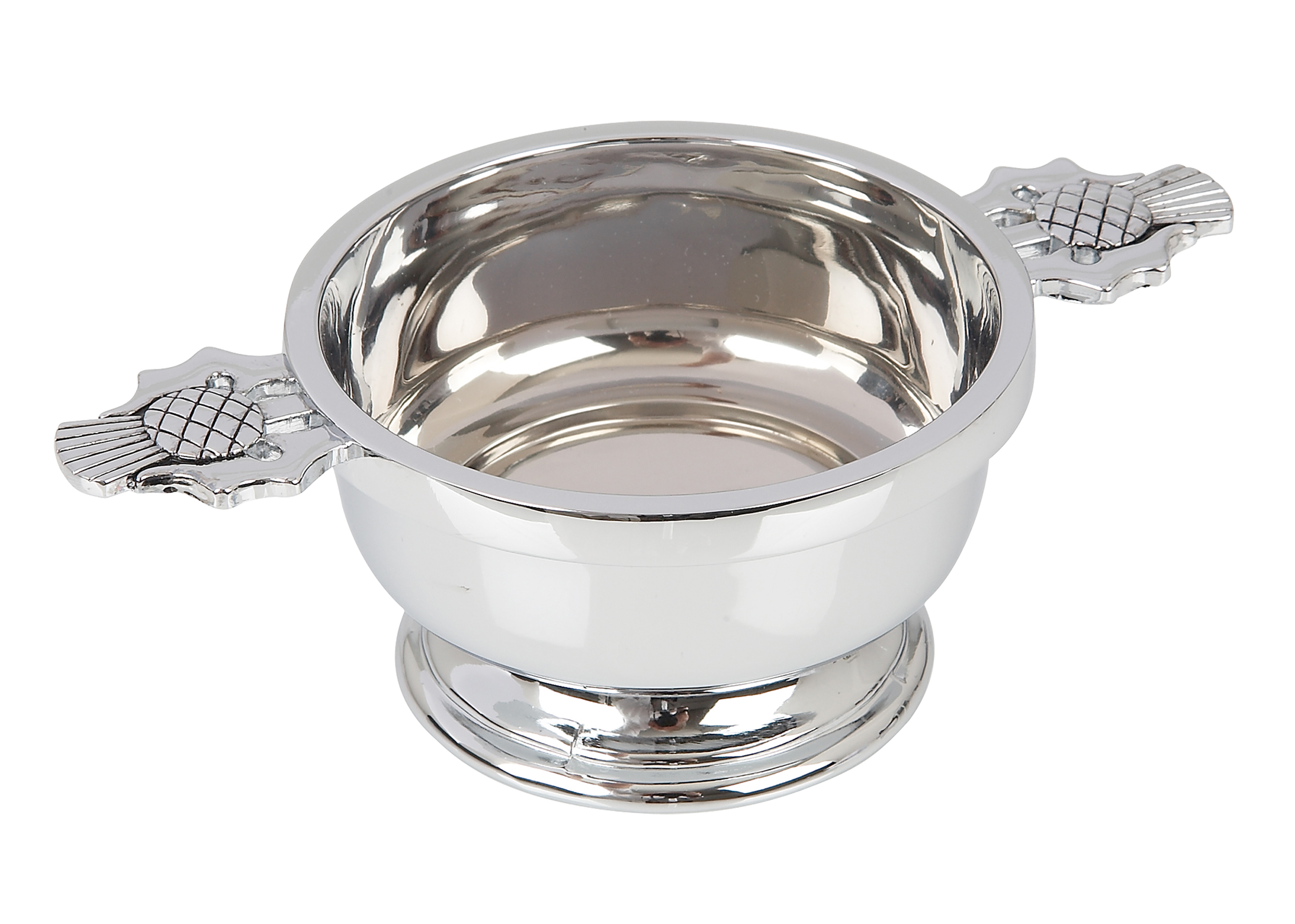 4" Chrome Plated Quaich with Thistle Handles. The word quaich is derived from the gaelic word "cuach" which means shallow cup or as we know it today, a drinking cup of friendship. Supplied in a gift box & story card.
