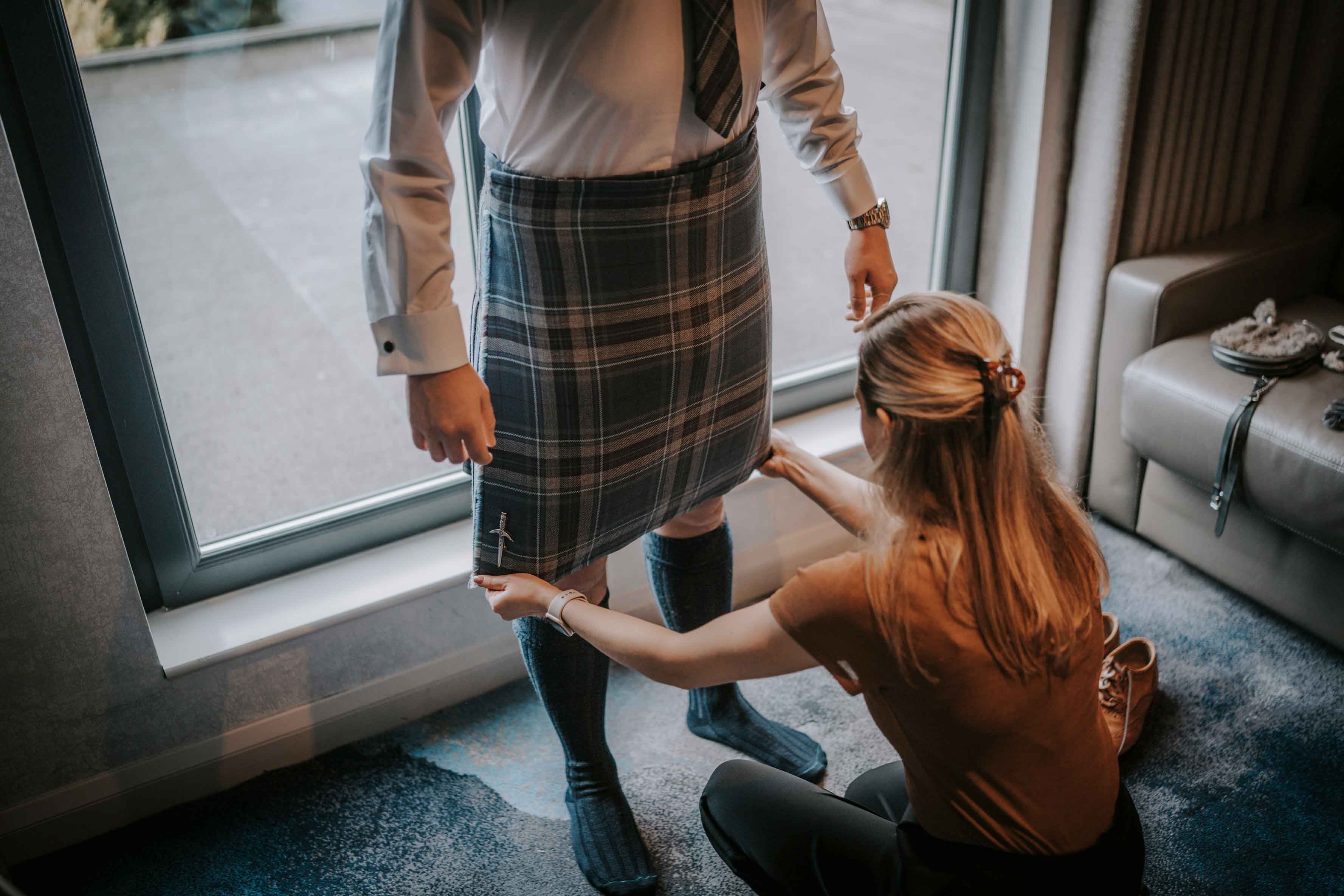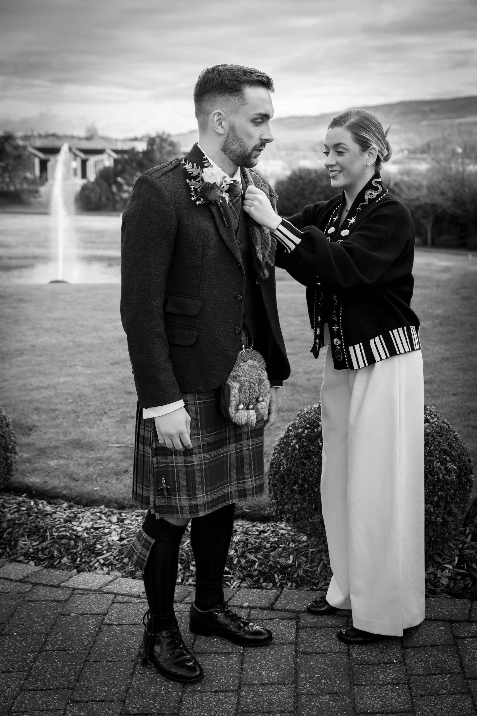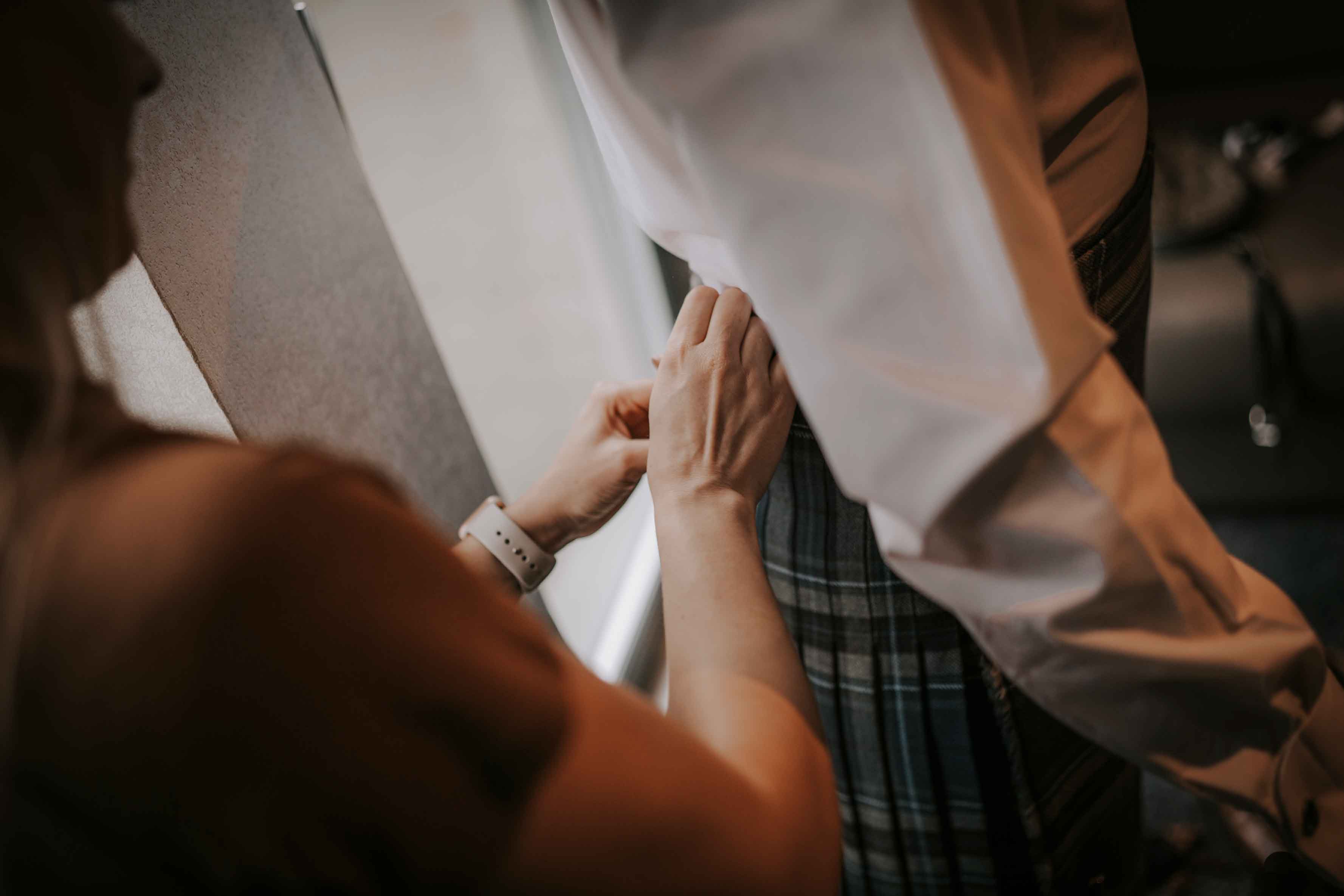 - Check all kilts, jackets, ties, shirts, and accessories are fitted correctly
